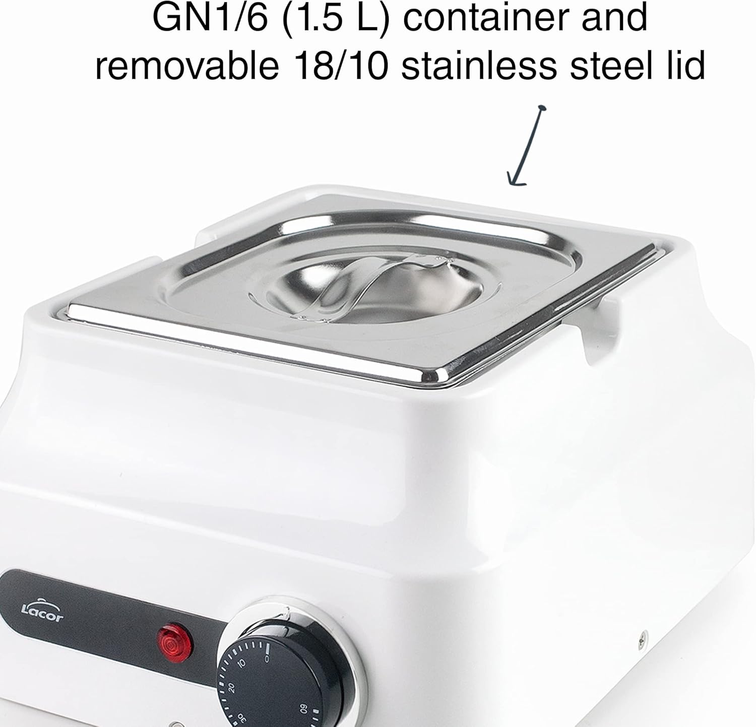 Elle est dotée d’un voyant lumineux qui s’allume dès que la température souhaitée est atteinte. Le bain-marie est compatible avec les seaux Lacor
